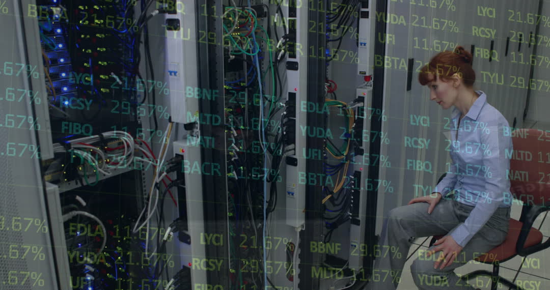 - Female Engineer Analyzing Data in Server Room with Financial Overlay