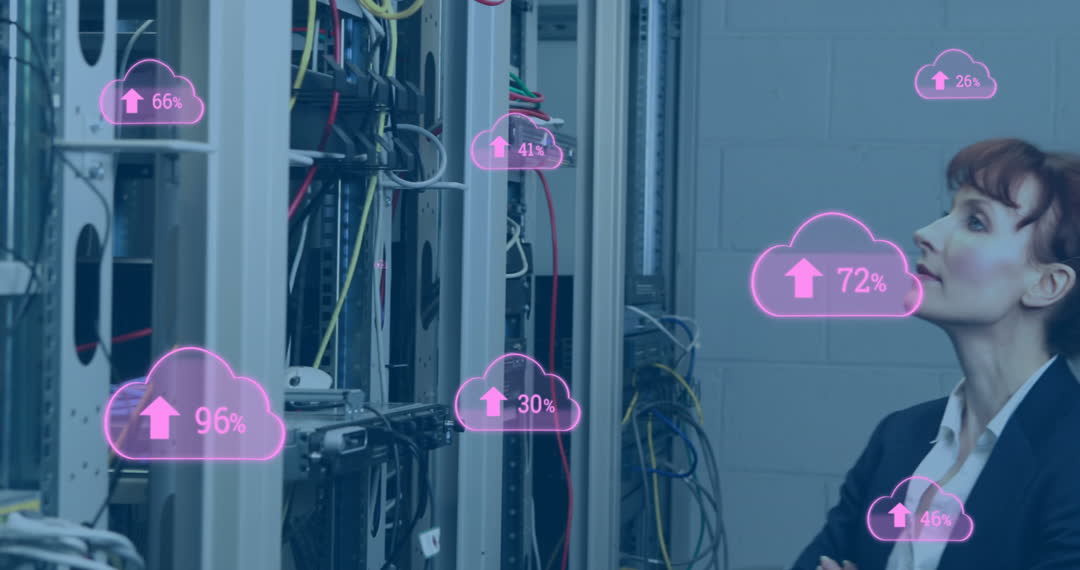 A female engineer is analyzing data in a server room. Pink cloud icons displaying percentages suggest data transfer rates or cloud performance metrics. This visualization accentuates digital monitoring efforts typical in tech-driven environments. Useful for illustrating concepts related to cloud computing, network infrastructure, data analysis, IT professions, or promotional materials targeting IT sectors.