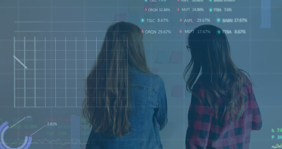 Two female executives are engaged in a discussion set against animated stock market diagrams, symbols, and graphs. They are seen collaborative and analytical in a corporate environment. This visual can be used in articles, reports, or presentations showcasing teamwork in financial and business strategy, as well as for impactful visual enhancements on business and investment platforms.