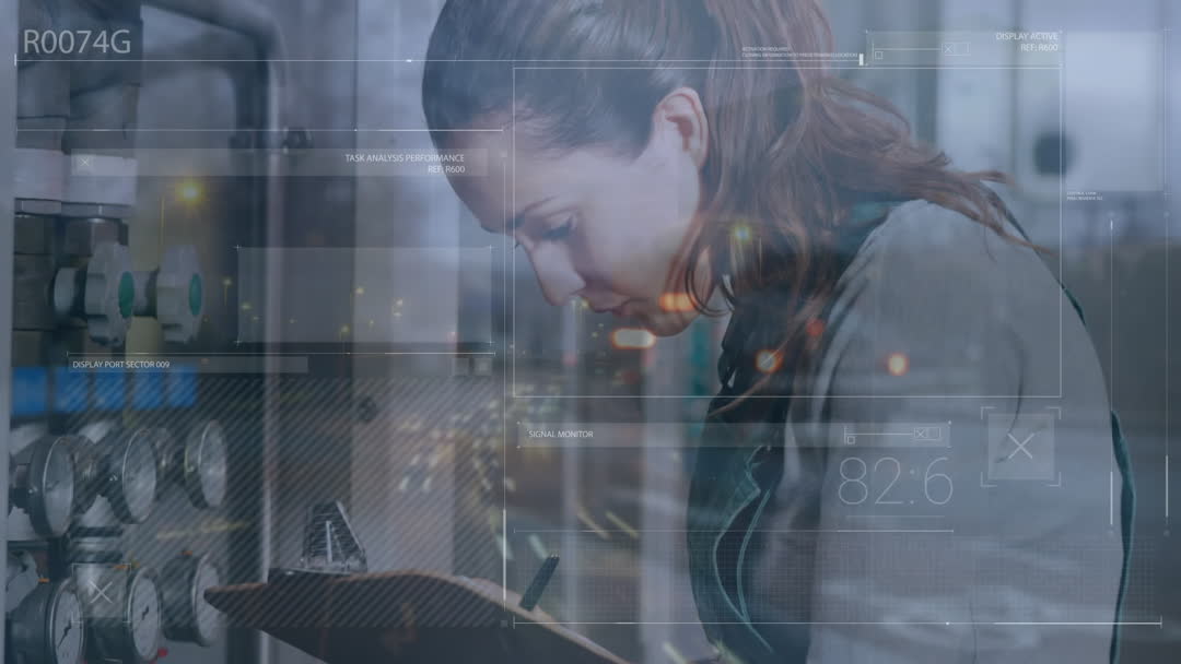 Female Factory Worker Analyzing Data with Digital Overlay Interface Video