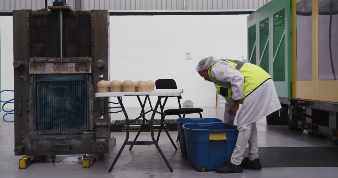 A female worker in a factory busy at preparing and packing plastic parts. She wears a high visibility vest, protective gear, and works with various machinery, showing the industrial workflow within a busy warehouse. This videory is ideal for illustrating concepts related to female workers in manufacturing, highlighting industrial processes, factory efficiency, and occupational safety.