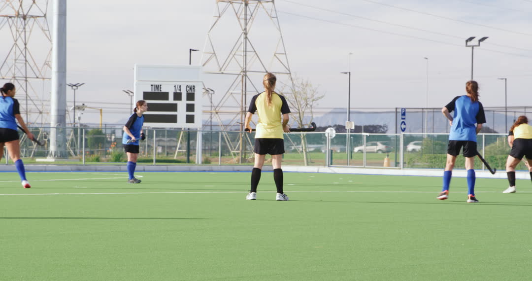 Group of female hockey players actively engaging in a thrilling field match emphasizes dynamics of teamwork and competitive spirit. Ideal for illustrating women's sports, promoting field hockey, or depicting athletic events and resilience in competitions.