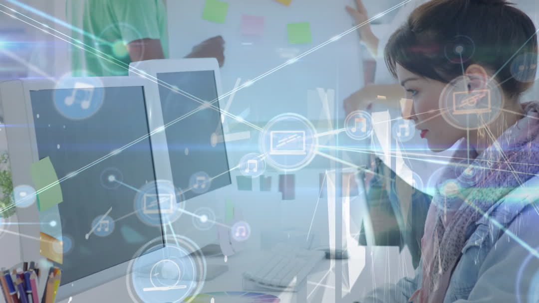 Female graphic designer focusing on work with a digital network interplay creatively depicted with translucent icons floating across the scene. Ideal for illustrating modern work environments and technological landscapes, suitable for articles on innovation, digital communication, or creativity in the workplace.