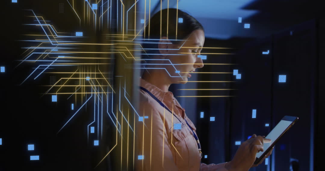 The video depicts a female IT engineer engaged with digital technology, examining data with an animated circuit board overlay set against computer servers. This depiction highlights a modern, tech-driven environment suggesting high competence in handling digital infrastructures. It can be used in contexts such as articles on technological advancements, advertising campaigns for IT services, or educational content about careers in technology.