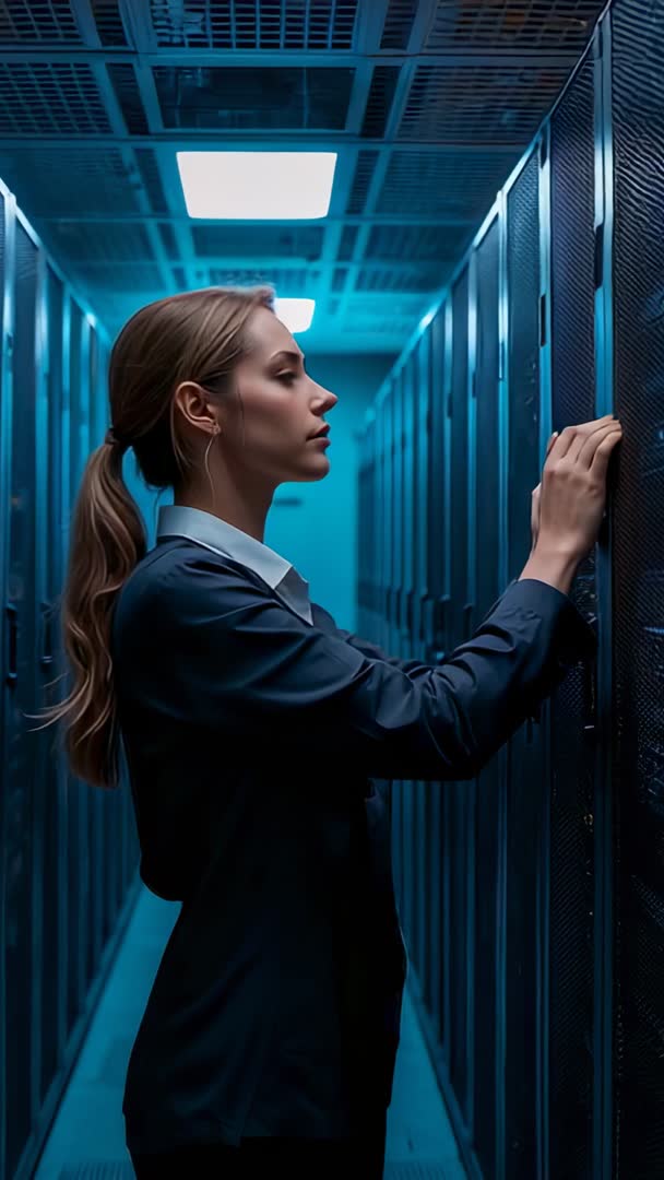 AI Generated Image. Showing female IT engineer inspecting server rack in blue-lit data center aisle, touching perforated cabinet door and monitoring status lights while performing maintenance. Vertical frame capturing narrow aisle, cool blue tones, and focused professional profile, suitable for mobile-first delivery. Serving well for corporate technology promos, cybersecurity presentations, IT recruitment campaigns, training modules, and social vertical ads. Offering clean space for overlay text, lower third, or voiceover and providing cinematic B-roll for broadcast news, website hero reels, app onboarding, and conference openers. Suggesting use of slow pans, close-up cuts of hardware, and subtle color grading to enhance technical mood and visual storytelling.