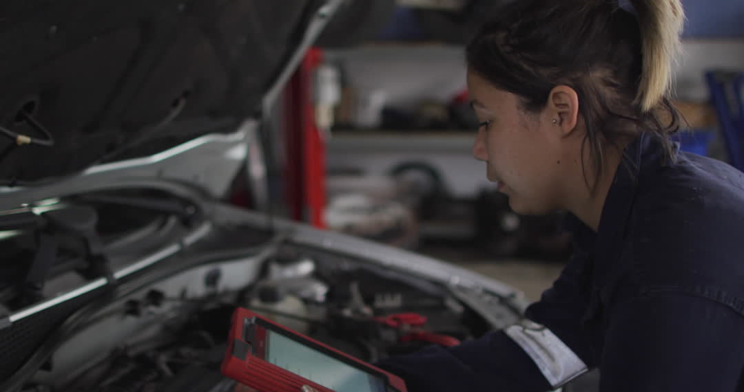 - Female Mechanic Diagnosing Car with Diagnostic Tablet Technology