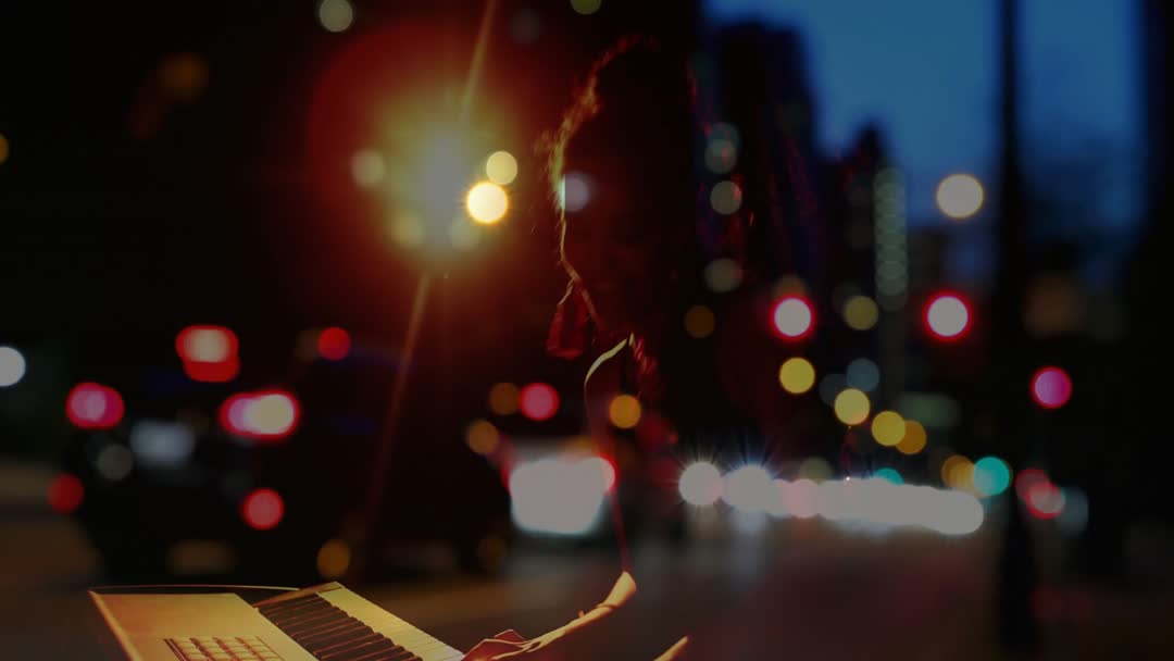 - Female musician with bokeh city lights, performing vibrant keyboard concert
