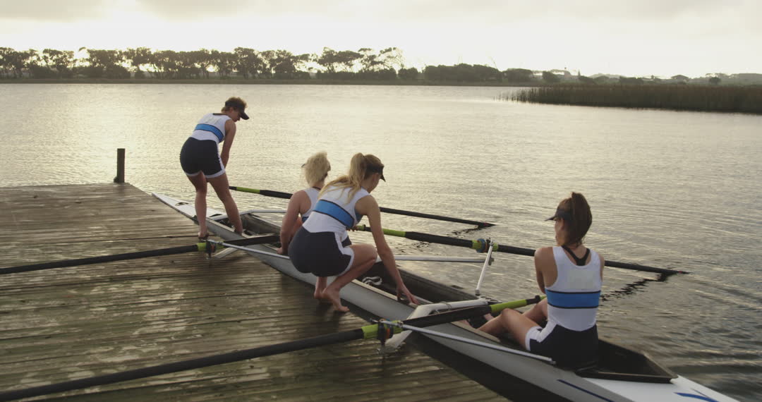 A group of young female rowers docking their racing shell on a jetty after an intense training session on the river. This captures teamwork and determination, fitting for topics on sports, fitness, and teamwork-related messaging in marketing materials or sports event promotions.