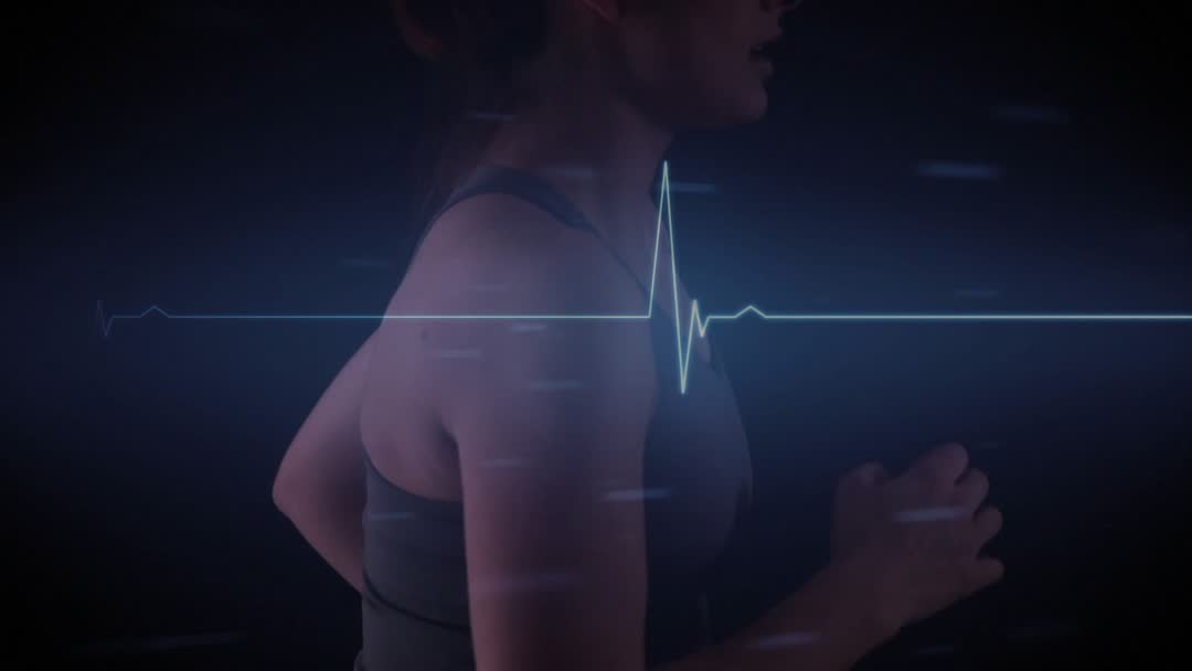 - Female Runner Jogging with ECG Heartbeat Overlay Aligning to Chest Monitoring Cardio