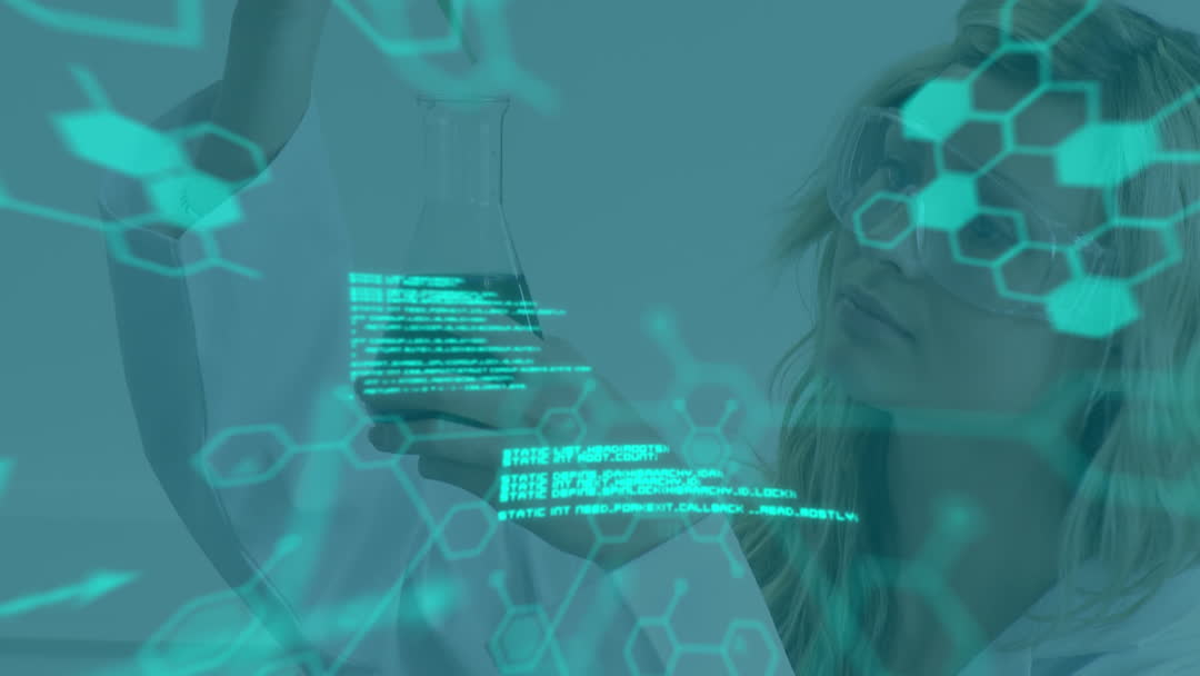A female scientist is examining a test tube in a laboratory while scientific data and chemical formulas float around her. The setup suggests advanced scientific research, technological innovation, and data analysis. This videory can be ideal for illustrating progress in scientific research, educational content on chemistry, or promotional material for technology-focused organizations.