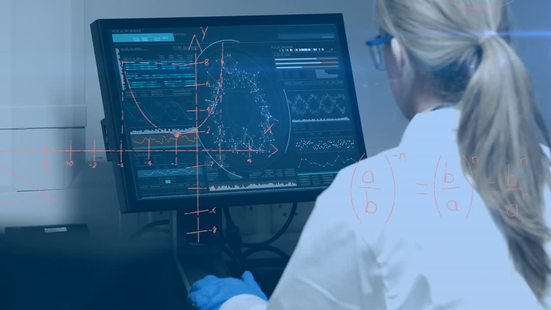 Scene depicts a Caucasian female lab worker intensely focused on computer screen visualizations and equations, signaling modern scientific research. Useful for illustrating themes of innovation, technology in research, lab environments, or workflow efficiency in scientific settings.
