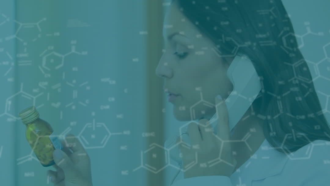 Caucasian female scientist is on the phone while holding a bottle of pills, surrounded by overlapping videos of chemical formulas, symbolizing research and communication in pharmaceutical sciences. Useful for concepts involving medical research, pharmaceutical innovation, digital healthcare, and biotechnology advancements.
