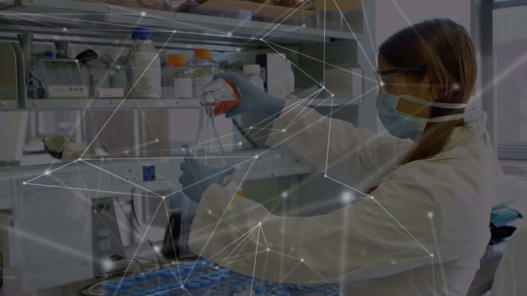 A female scientist wearing a lab coat, gloves, and safety glasses is conducting research. She is handling laboratory apparatus and chemicals. Overlay of network connections videory adds a futuristic element, suggesting alignment between science and digital technology. Perfect for illustrating themes in magazines or presentations about modern scientific methods, technological advancements, or STEM education videory.