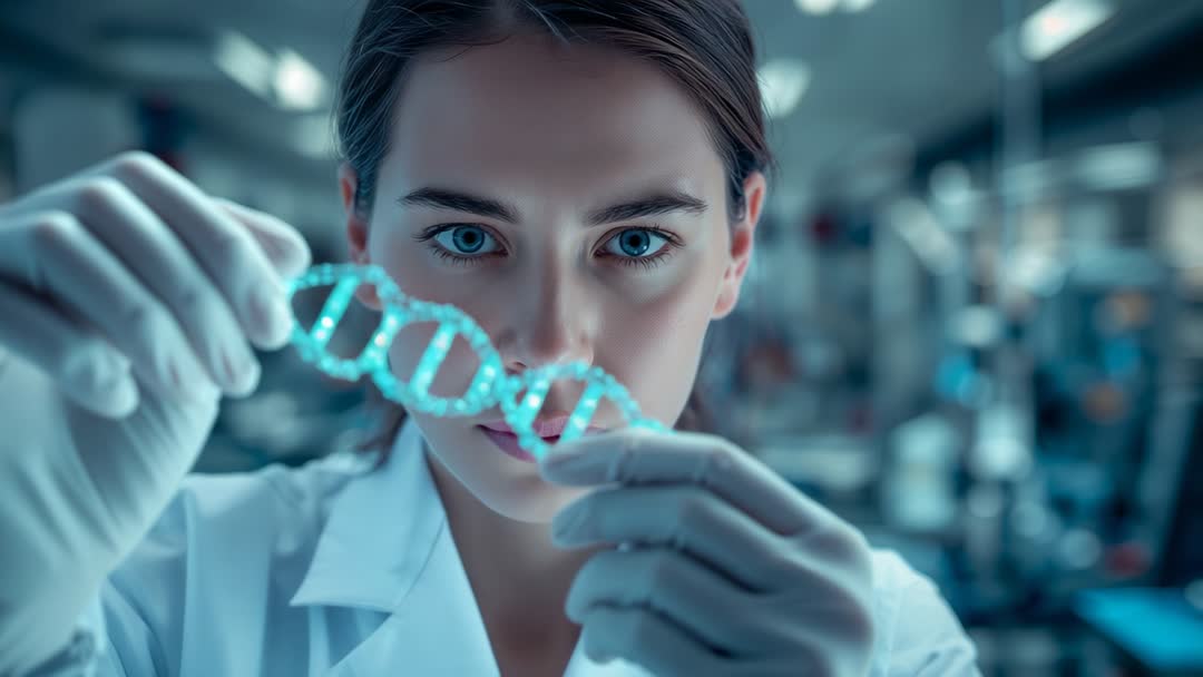 AI Generated Image. Female scientist examining glowing DNA helix with gloved hands, rotating strand for closer inspection. Closeup capturing intense gaze and precise hand movements, conveying scientific focus and technical expertise. Cool-toned lighting and phosphorescent helix creating futuristic, high-tech atmosphere ideal for cutting-edge research narratives. Use for illustrating genetic research, biotechnology marketing, medical training videos, lab procedure demonstrations, corporate innovation reels, STEM outreach and recruitment. Edit-friendly composition with shallow depth of field and central subject providing space for lower thirds, titles, and explanatory graphics. Suitable for background clips in presentations, website hero sections, social media campaigns, and educational modules on genetics and molecular biology.