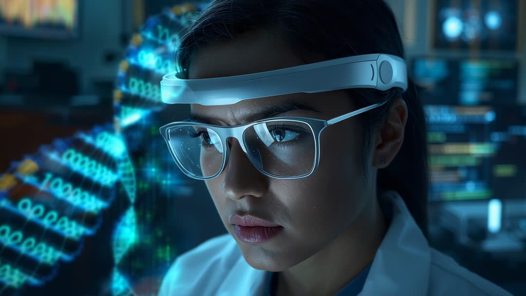 - Female Scientist Wearing AR Headband Analyzing Holographic DNA Helix While Monitoring Genomic Data