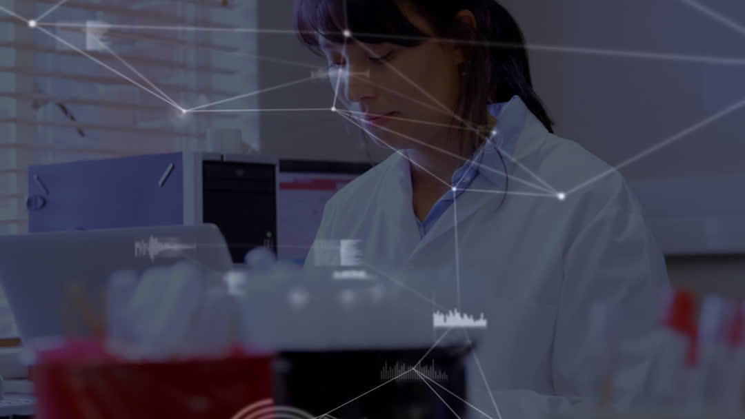 - Female Scientist Working in Laboratory with Digital Network Overlay