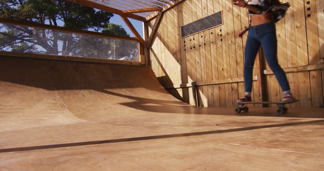 Young woman skateboarding inside an indoor skate park filled with natural light. This setting showcases the skateboarder's dynamic maneuvering across a wooden half-pipe. Perfect for content related to sports, hobbies, youth culture, and the thrill of mastering new skills. Ideal for promoting active lifestyles and sports products.