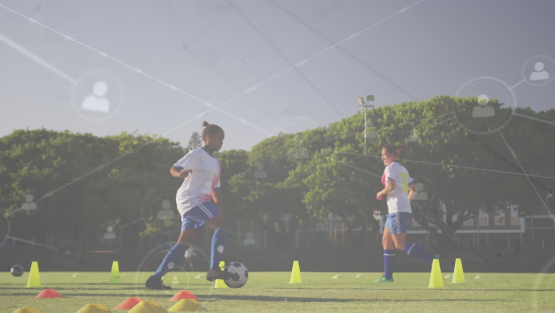 Energetic scene capturing female soccer players on the field with a futuristic digital network overlay. Features two players focusing on drills, enhancing strategies with the aid of technology. Perfect for illustrating advances in sports training via technology, women in sports, or teamwork and coordination in athletic activities.