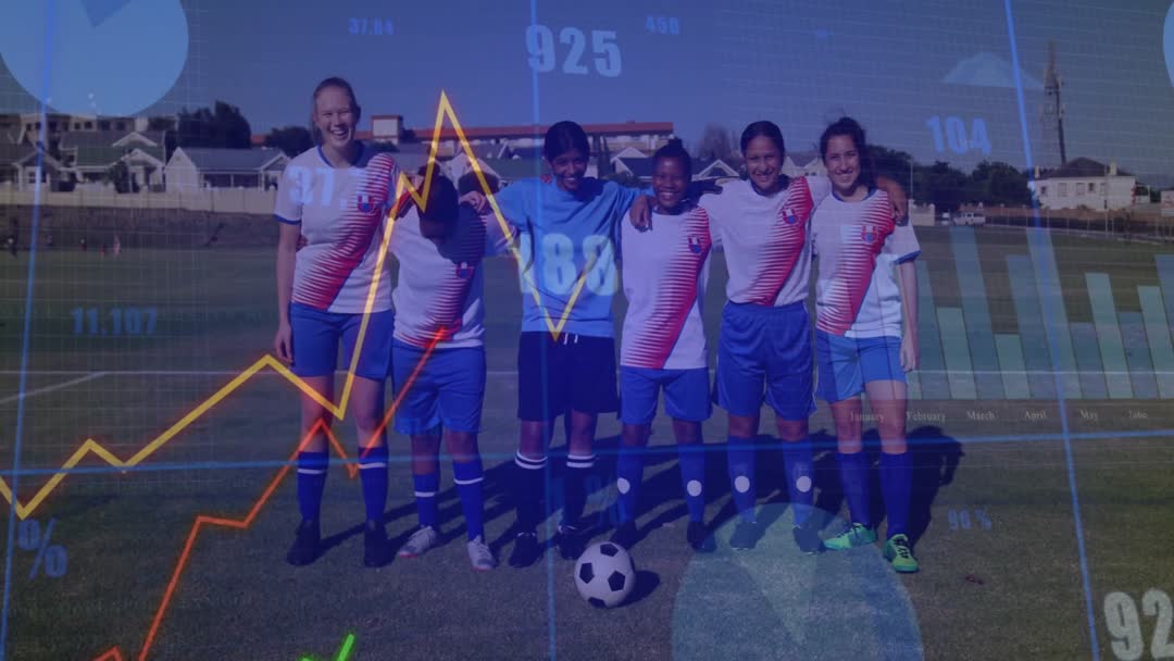 Group of six female soccer players standing together on a lush green field, flanked by visual graphs symbolizing data analysis and progress. This illustration of unity and sports complements themes of athletic development through data analytics. Helpful for marketing materials about sports science, articles on teamwork in sports, or any content discussing the interdisciplinary nature of modern sports management.