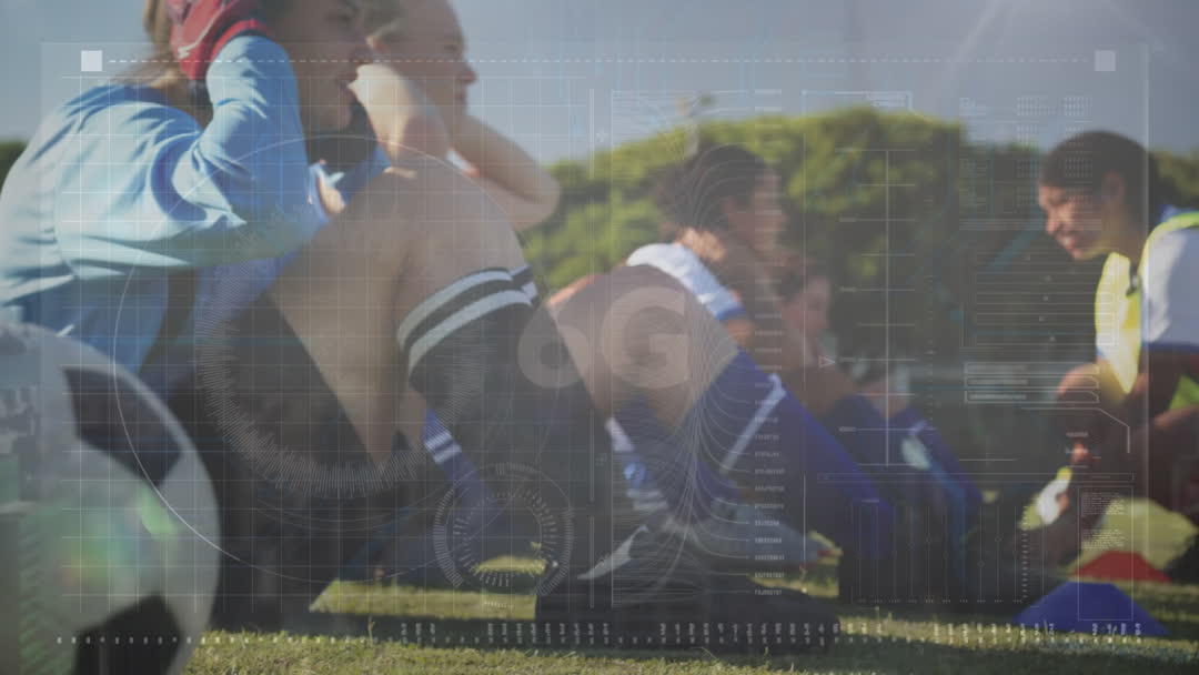 This video depicts diverse female soccer players performing sit-ups on the field with a coach or captain guiding them. The digital data overlay signifies modern training techniques or analysis potential. It is ideal for articles, marketing, or reports related to sports analytics, team training, women's sports, or fitness development.
