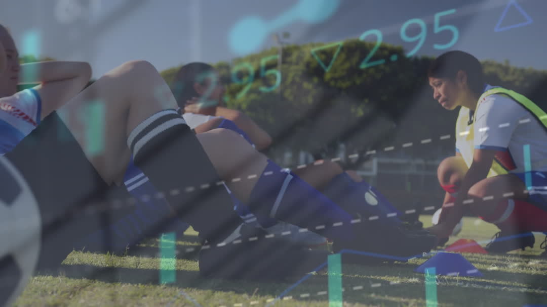 Image depicts a group of female soccer players engaging in sit-up exercises on a soccer field while their teammate leads a training session. Overlay of financial data and graphs adds a unique contrast, representing themes of athletic performance and analytics. Useful for illustrating connections between sports and data-driven insights or enhancing content related to women in sports and economic analysis.
