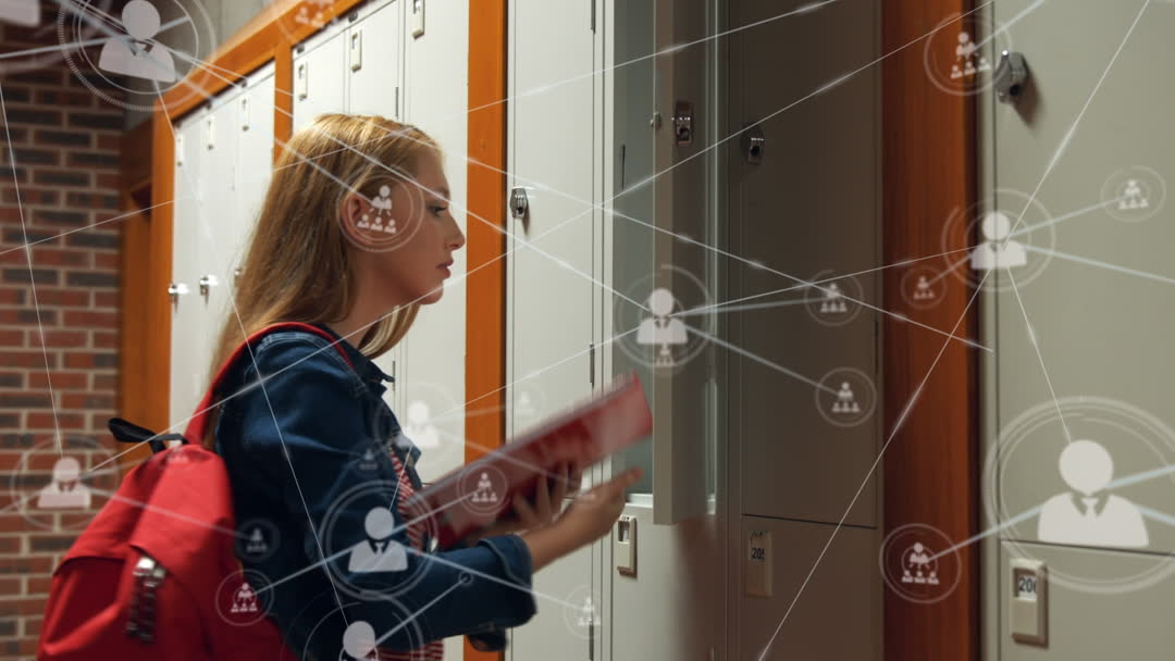 Caucasian female student standing near lockers while engaging with technology and network connections, symbolizing education and learning in a digital age. Ideal for illustrating concepts related to modern education, technology in schools, or cybersecurity for student populations.