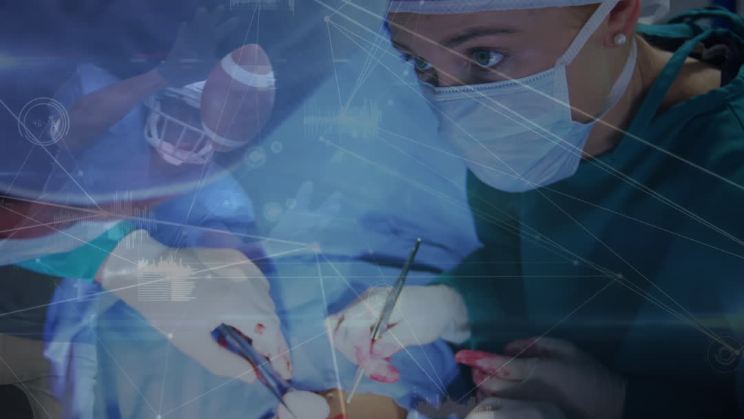 - Female Surgeon in Operating Room with Digital Networks Overlay