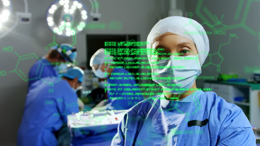 This video showcases a female surgeon in the operating room, enhanced with projections of digital data and chemical structure graphics. Ideal for illustrating themes of futuristic medicine, the integration of technology in healthcare, or cutting-edge surgical techniques. Useful for medical journals, surgical training videos, or advertising healthcare tech platforms.