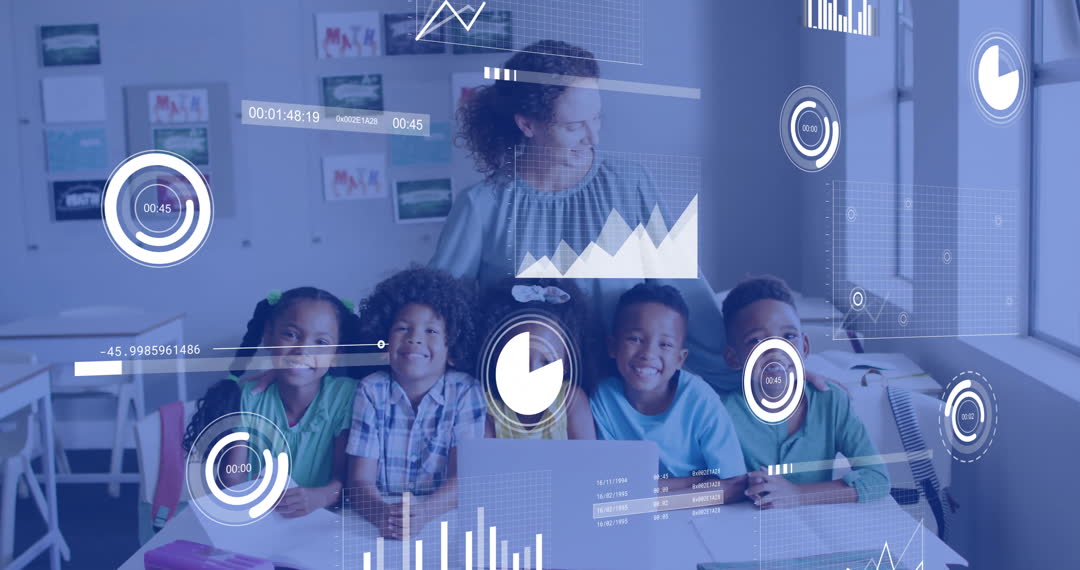 This video depicts a female teacher engaging with diverse students, integrating data analytics and digital charts in an educational setting. It represents the use of technology to enhance learning in modern classrooms. Ideal for educational websites, tech in education articles, and content about innovative teaching methods.