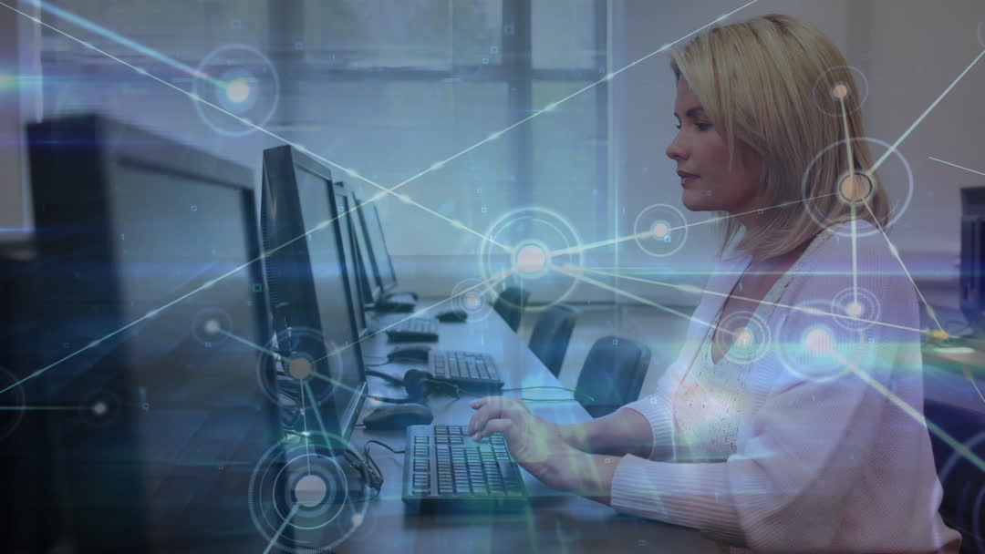 Female Teacher Using Computer with Digital Network Overlay Video