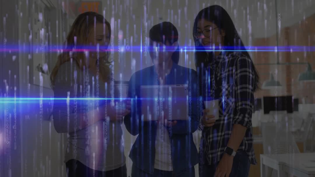 Women using a tablet while digital code and blue glitch lines project in the foreground, creating a modern and futuristic vibe. Perfect for illustrating concepts of women in tech, collaborations, and digital workspaces. Can be used in articles and presentations promoting diversity in technology and showcasing modern, innovative teamwork environments.
