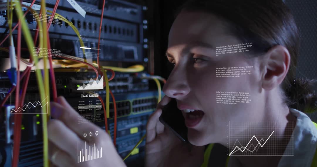 A female technician is multitasking while on an important call, attentively adjusting network rack cables. Superimposed data charts underscore focus on technology and data analytics in real-time. Useful for illustrating modern IT environments, networking solutions, decision making in technology fields, connectivity enhancement, and cybersecurity management.