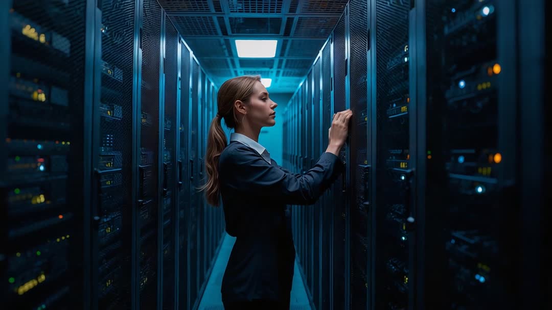 AI Generated Image. Clip showing female technician walking along data center aisle, inspecting server racks and adjusting network equipment under cool blue lighting. Cinematic depth of field highlighting focused expression and LED status lights, creating high-tech atmosphere. Working well for technology marketing, IT infrastructure presentations, cybersecurity training, cloud services promos, data center tours, recruitment ads. Working well as website hero background, explainer video segment, corporate presentation opener, social media short, or trade show loop. Suggesting slow motion reveal, cut to close-ups of rack panels and cable connections, overlay text for messaging, color grade for cooler tone, and adding ambient electronic sound design. Useful for conveying professionalism, reliability, technical expertise, network maintenance, and high-availability infrastructure.