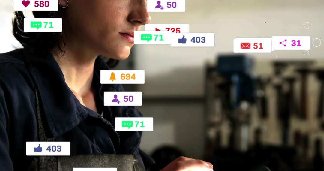 Female technician tapping tablet, floating notification badges showing likes, comments, follower counts and alerts across blurred workshop background. Scene conveying operator monitoring real-time job updates, digital dashboard and connected devices on production floor. Footage suiting corporate video, industrial IoT demo, factory safety training, maintenance workflow tutorial, social media campaign and product launch. Serving website hero, header video, explainer clip, promotional ad and internal operations dashboard. Allowing simple replacement of badge graphics with custom branding for illustrating KPI tracking, predictive maintenance alerts, remote monitoring, workforce communication, customer engagement and digital transformation messaging. Color grading and graphic overlays aligning with brand guidelines; cropping for widescreen or square formats; adding captions for accessibility and SEO. Ideal for looping background or 10-30 second promotional cuts.