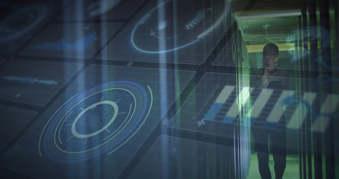 Showing female technician walking down server rack aisle while checking handheld device and HUD overlay displaying diagnostics, status bars, and circular telemetry. Lighting and green-blue color grade creating futuristic, high-tech atmosphere ideal for tech storytelling. Composition leaving left side open for headline, lower-third, or branded graphics. Clip working well for corporate tech videos, cybersecurity presentations, data center marketing, IT training modules, product demos, website hero banners, or conference backdrops. Suggestion for editors: animate HUD elements, replace overlays with custom dashboards, or use slow push-in to emphasize diagnostics and network monitoring themes.