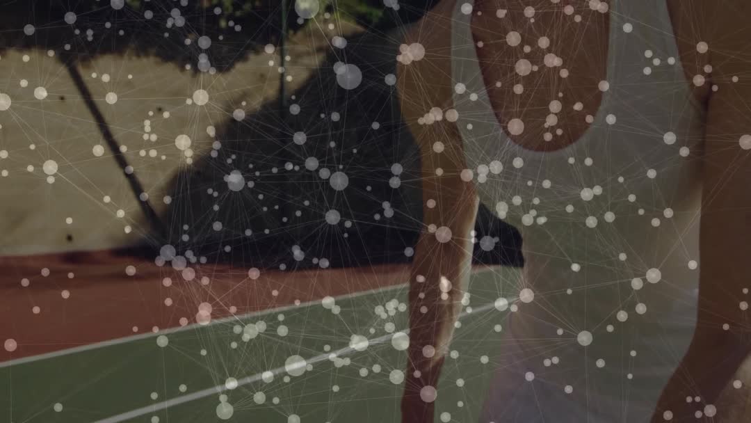 This video blends athletic action with a futuristic digital networking overlay, symbolizing the intersection of technology and sports. Ideal for use in contexts highlighting advancements in sports technology, fitness apps, intelligent wearables, or as a modern sports promotion. Can be used in articles, advertisements, or websites focusing on innovative sports trends or female athletic accomplishments.