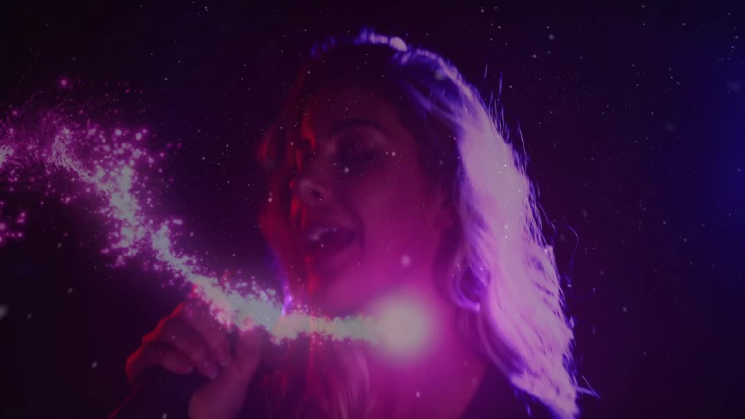 Female Vocalist with Glowing Particles in Energetic Stage Performance Video