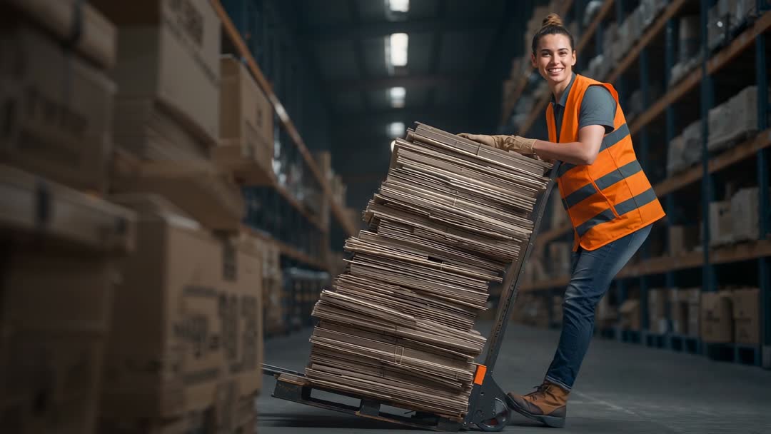 AI Generated Video. Video showing female warehouse worker wearing orange high visibility vest and gloves, smiling while pushing hand truck loaded with neatly stacked flattened cardboard boxes down long industrial aisle lined with metal shelving and stacked cartons. Scene featuring organized inventory, safety gear, and active material handling in modern distribution center. Camera capturing medium shot with shallow depth of field, emphasizing worker focus and friendly expression while load tilts slightly on dolly for dynamic motion. Suitable for illustrating logistics operations, warehouse safety training, e-commerce fulfillment, packaging and recycling workflow, supply chain marketing, and staff recruitment campaigns. Ideal for website hero banners, social media ads, corporate presentations, training manuals, editorial articles, and product packaging mockups. Recommended editing ideas: adding lower-third copy, overlaying company logo, color grading for branded look, slowing motion for dramatic emphasis, cropping for vertical mobile formats, combining with close-up cutaways of hands and shelving for richer sequences.