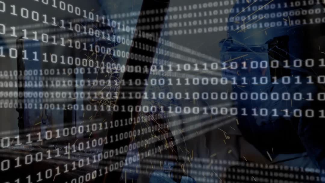 This video combines traditional craftsmanship with modern technology, showcasing a female welder working on a metal beam. The overlay of cascading binary code represents digital innovation and technological advances in manufacturing. Useful for illustrations highlighting the integration of technology in industrial workspaces or for promoting gender diversity in trades.