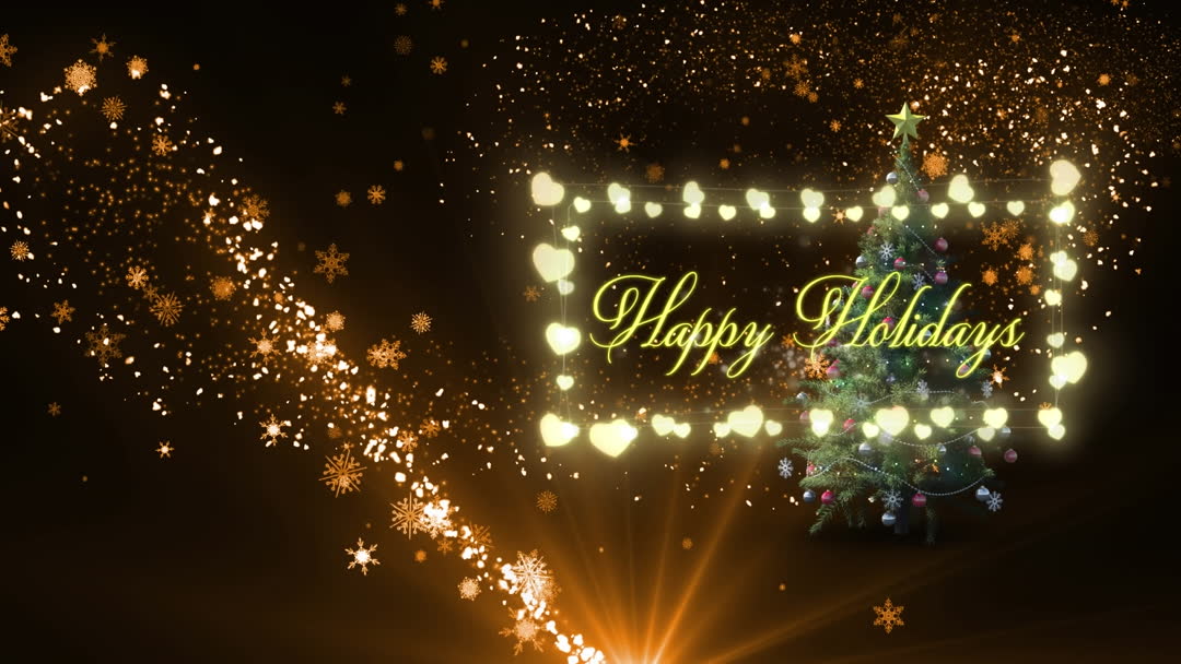 Animated scene features 'Happy Holidays' in glowing letters beside twinkling Christmas tree and falling snowflakes. Glittering elements create feel of enchantment, perfect for digital holiday greetings or seasonal advertising. Ideal for sharing joy and festive spirit in online posts or e-cards.