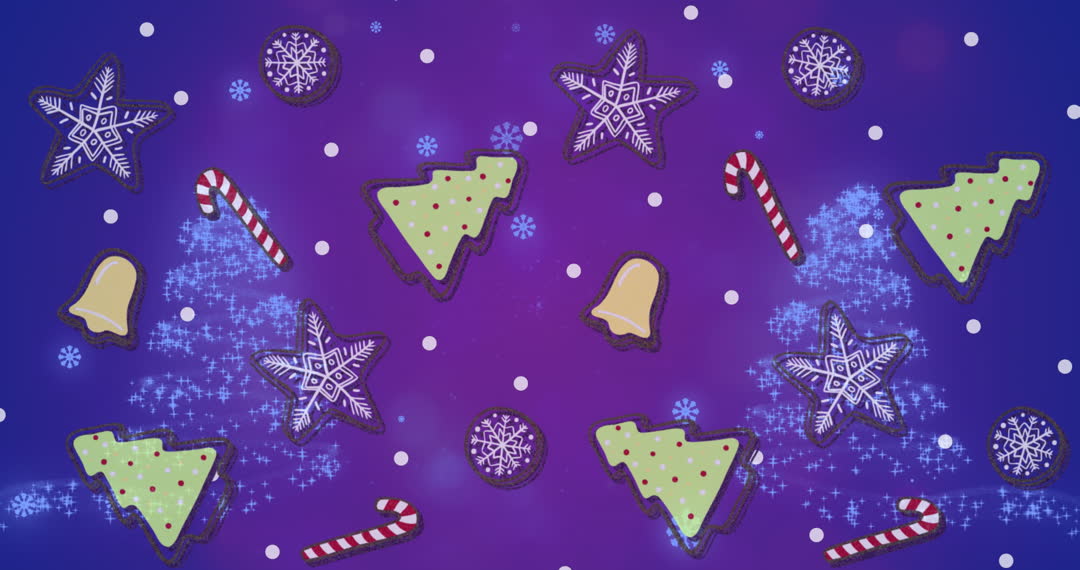 Animated Christmas elements against a vibrant purple background. Shooting stars form Christmas trees, enhancing decoration possibilities. Featuring candy canes, snowflakes, and bells, it is perfect for a festive greeting card, holiday event invitation, or digital backdrop design celebrating the holiday season.