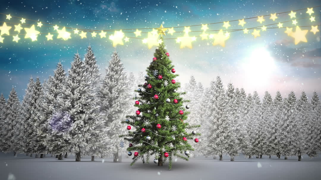 Animated scene featuring decorated Christmas tree with red and silver ornaments, surrounded by snowy pine trees under twinkling stars. Perfect for festive backgrounds, holiday greeting cards, digital media, and seasonal advertisements.
