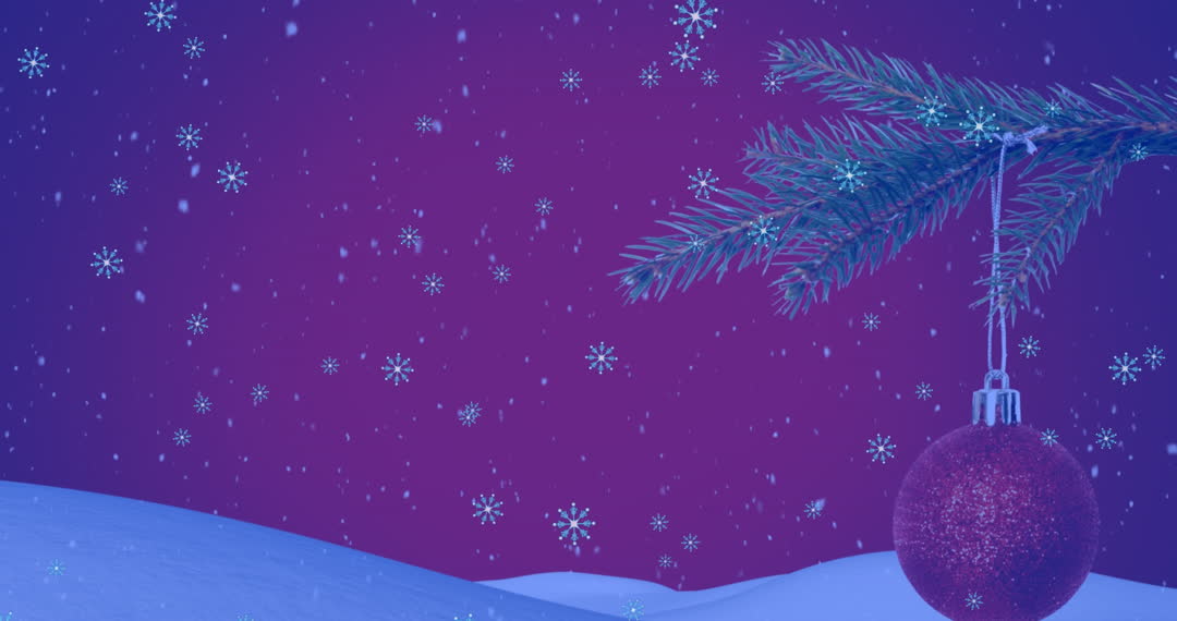 Animated scene featuring Christmas tree adorned with a red bauble, with delicate snowflakes falling against a purple backdrop and snowy landscape. Captures a festive winter atmosphere. Perfect for holiday greeting cards, digital backgrounds, or seasonal marketing materials emphasizing warmth and cheer.
