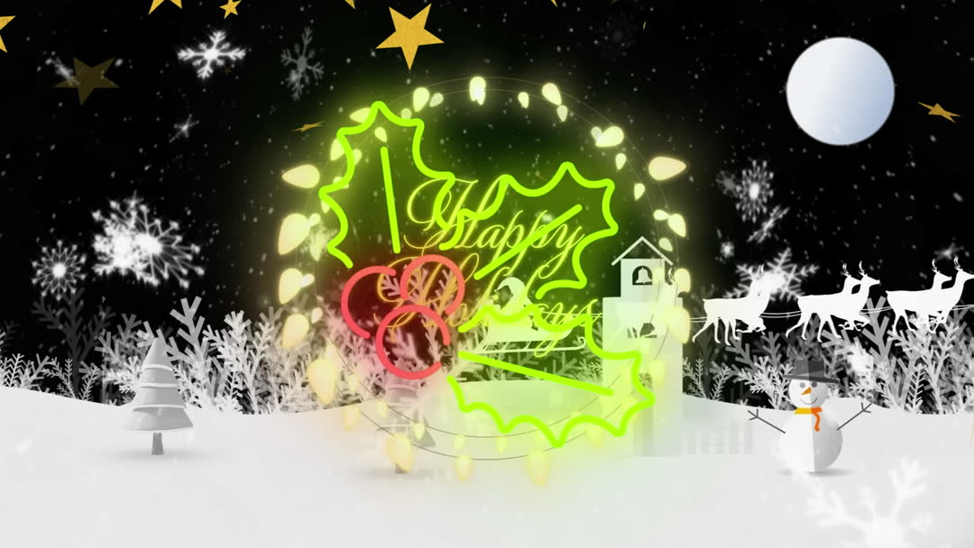 Festive animation celebrating the holiday season, featuring neon mistletoe, falling snow, and cheerful text. Perfect for greeting cards, festive social media posts, or adding seasonal ambiance to digital content.