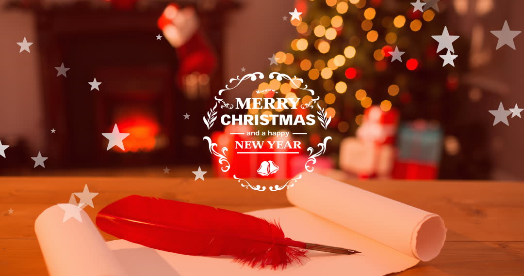 Festive animation overlay with Merry Christmas message displays over a cozy interior scene. Background shows a decorated Christmas tree with glowing lights and a fireplace, creating a warm holiday atmosphere. Suitable for holiday greeting cards, digital greetings, Christmas event invitations, or seasonal marketing promotions.