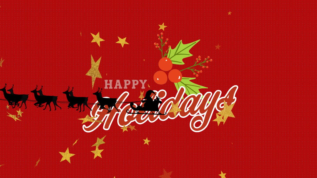 The animation showcases a charming design of Santa Claus in his sleigh led by reindeers against a vibrant, red backdrop with golden stars. Text reading 'Happy Holidays' accompanies holly and berry motifs, enhancing the seasonal theme. Perfect for holiday greeting cards, Christmas invitations, social media posts celebrating the spirit of the festive season, or digital decoration during holiday events.