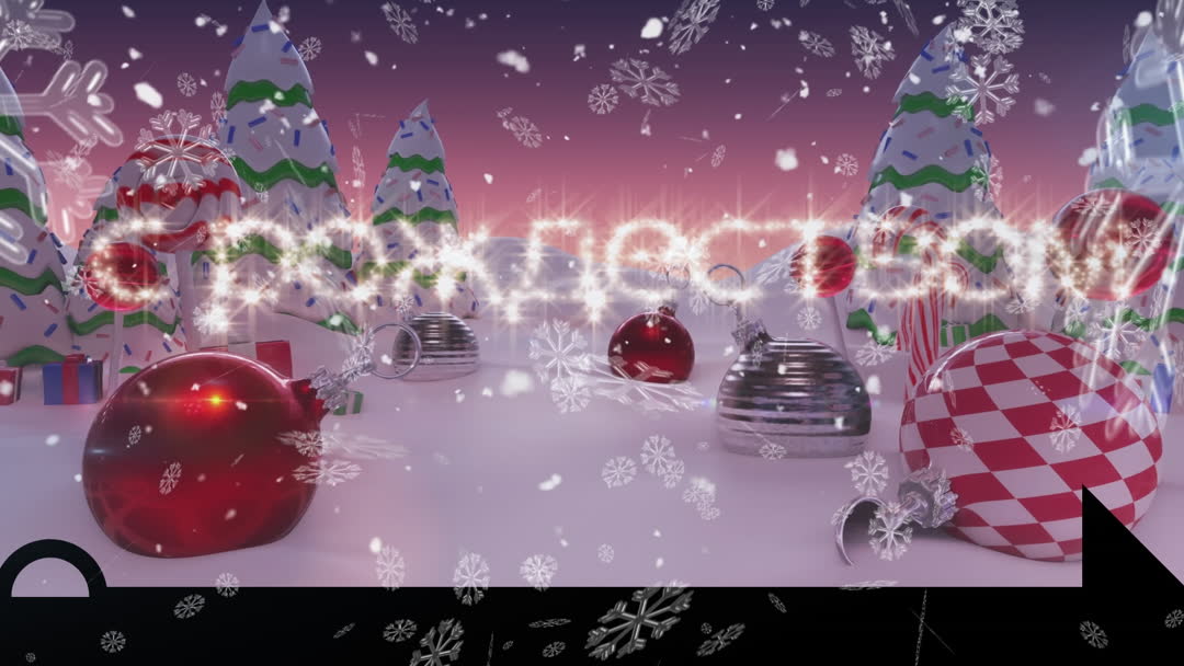 A captivating animated scene of Santa with reindeer in a magical, snowy landscape decorated with Christmas trees and red globes, creating a festive atmosphere perfect for holidays. This cheerful setting can be ideal for use in digital greetings, holiday advertisements, or social media content celebrating the Christmas season.