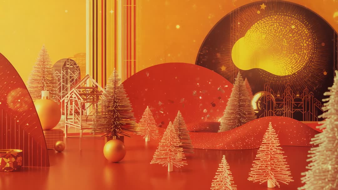 AI Generated Image. A visually captivating video featuring shifting lights and shimmering particles over stylized trees, columns, and an orb. The vibrant colors and festive elements, combined with an abstract composition, create a dreamy and decorative atmosphere. Perfect for holiday-themed decors, event visuals, and creative projects that require a blend of traditional festive elements with a modern, digital twist. Use this video to add a sense of magic and wonder to advertisements, holiday greetings, or social media promotions.