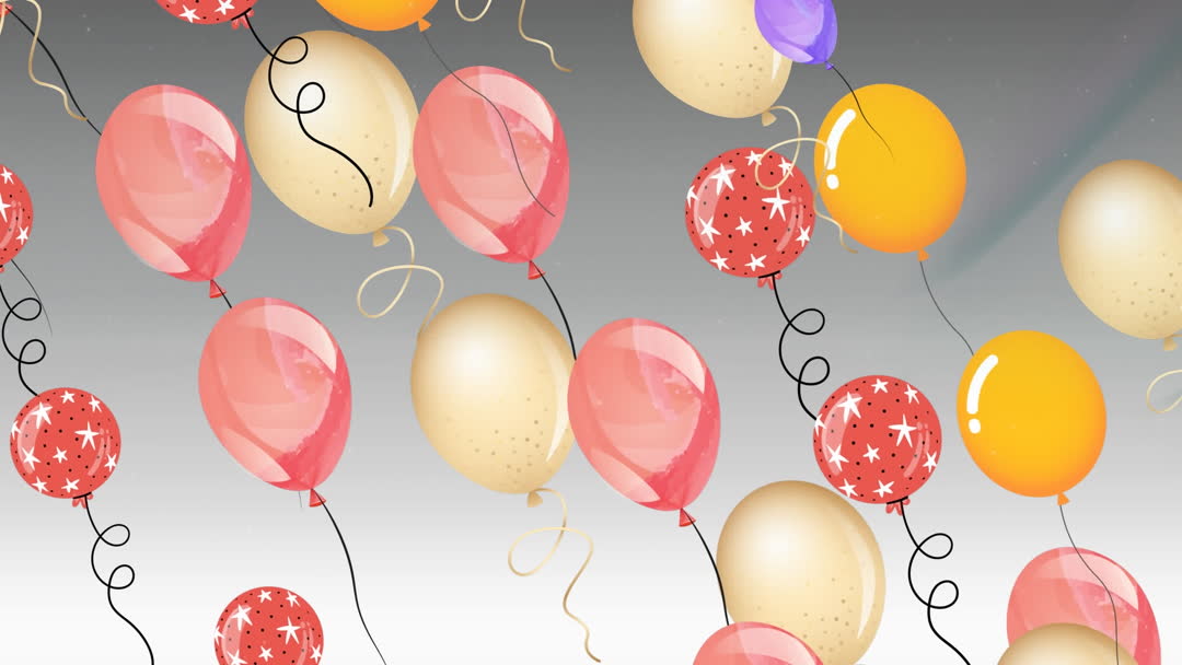 Brightly colored balloons against a winter sky creating a cheerful, celebratory mood suitable for holiday-themed content. Perfect for festive invitations, event promotions, or social media graphics celebrating special occasions and traditions. Digital animation adds a whimsical touch to party designs.