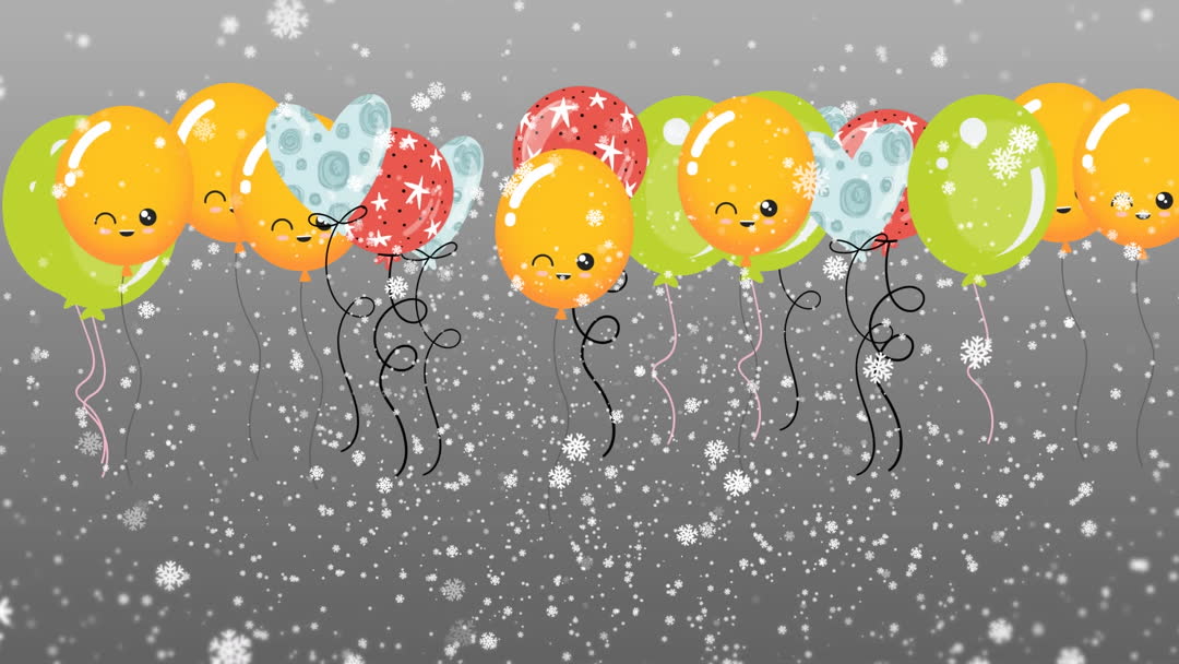 Illustration features playful balloons with smiling faces covered in falling snowflakes against a gray background. Ideal for festive invitations, winter themed parties, and celebration cards. Captures a cheerful vibe suitable for both children's events and holiday seasons.